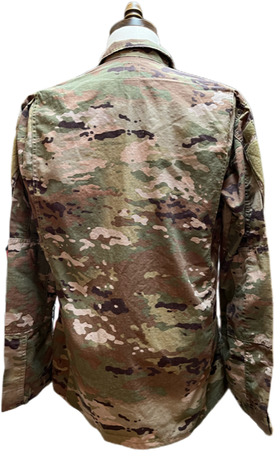 Description : This OCP uniform coat has external loop platforms for name tapes, badge, and rank, while a zipper placket and fold down collar lay flat underneath heavy plate carriers or tactical vests. Flame Resistant. Insect Guard. Camo blouses in Good condition show signs of wear like fading and loose threads. They are still structurally good but not inspection condition.