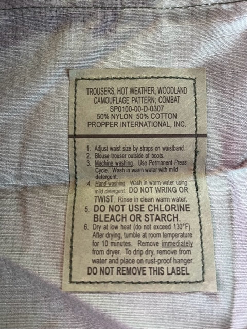 Description : The U.S. Army Men’s Hot Weather Operational Camouflage Pattern (OCP) Uniform Trousers in Woodland Camouflage are engineered for performance in warm and tropical environments. Constructed from a lightweight yet durable blend of nylon/cotton ripstop fabric, these trousers are highly breathable, quick-drying, and built to withstand rugged field conditions. Designed with mobility and functionality in mind, the trousers feature a straight-leg cut and reinforced seat and knees for increased durability. They include an adjustable waistband, button fly, and six strategically placed pockets: two slanted front pockets, two rear pockets with button flaps, and two spacious cargo pockets on the thighs with button closures and internal compartments. The trousers also feature blousing drawcords at the ankle cuffs to accommodate combat boots and help keep out debris. The woodland camouflage OCP pattern provides effective concealment across multiple terrains, blending seamlessly into wooded and temperate environments. Even though this pattern is no longer current for military use, these trousers are great for paintball, hunting, doing work around the house, costumes, theatrical productions, etc. Woodland camouflage trousers are in Very Good to Good condition have been previously worn unless marked Brand New With Tags (NWT) or Brand New With Out Tags (NWOT)