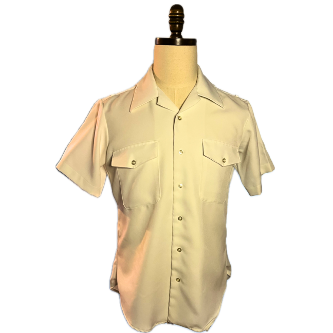 Description : This vintage short sleeve U.S. Navy male officer white service shirt is a classic uniform piece that reflects traditional naval professionalism and timeless style. Crafted to official specifications, it features a crisp white design with a structured collar, button-front closure, and tailored fit intended for officer wear. Ideal for service dress uniforms, ceremonies, inspections, or collection display, this shirt represents an earlier era of Navy uniform manufacturing. As a vintage item, it may show minor signs of age or previous use, adding to its authenticity and character. Please note that due to its vintage status, this shirt may not align with current uniform regulations, making it best suited for collectors, historical reenactments, theatrical productions, or non-regulatory wear.